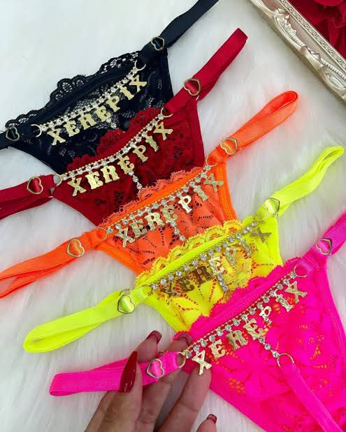 Calcinha de renda com palavra na parte de trás com strass podendo variar a renda.